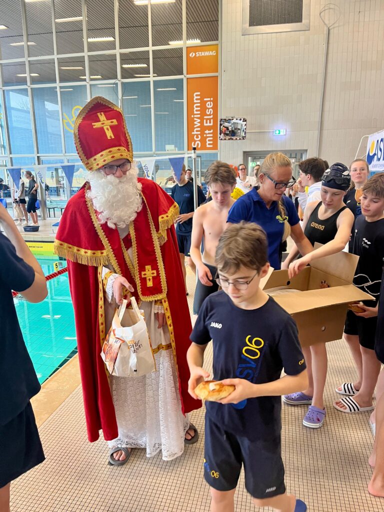 Zum Jahresabschluss, am 29.11.2025 – 30.11.2025, fanden die Bezirks-Kurzbahnmeisterschaften in der Schwimmhalle Aachen Ost statt. Traditionsgemäß kam natürlich auch wieder der Niklaus vorbei und die Schwimmer und Schwimmerinnen, aber auch die Kampfrichter und Schiedsrichter erhielten vom Nikolaus einen leckeren Broiche Mann.