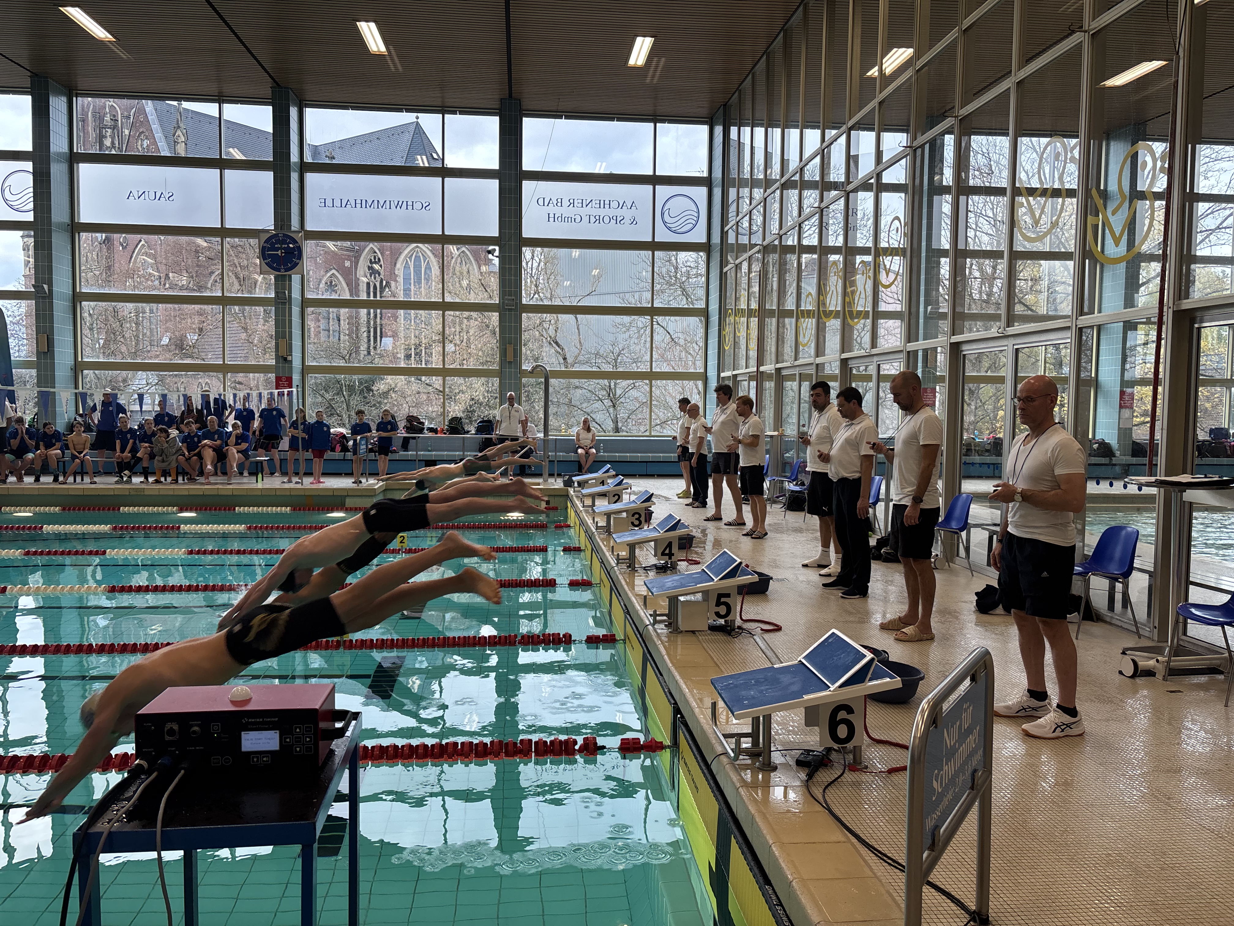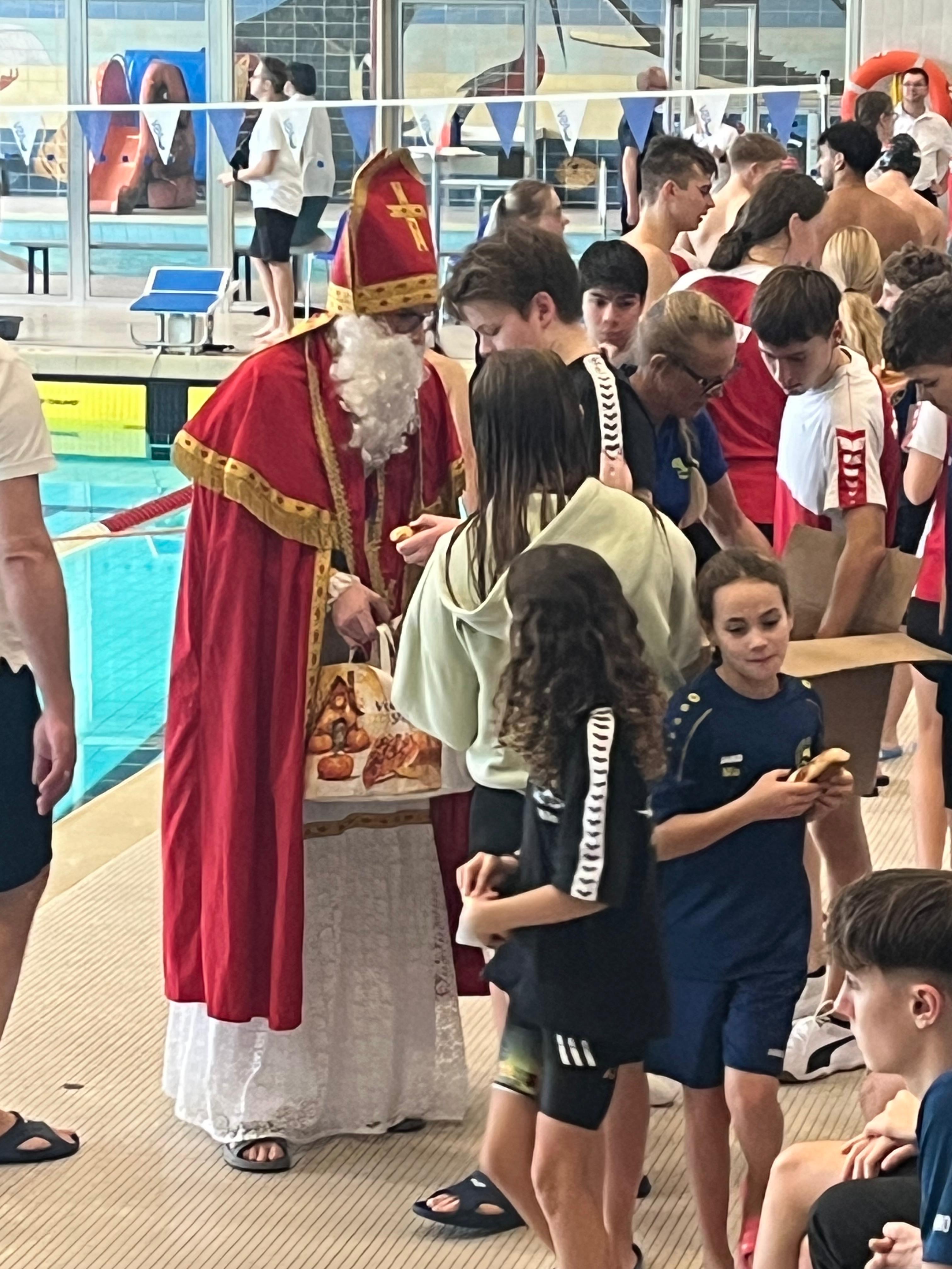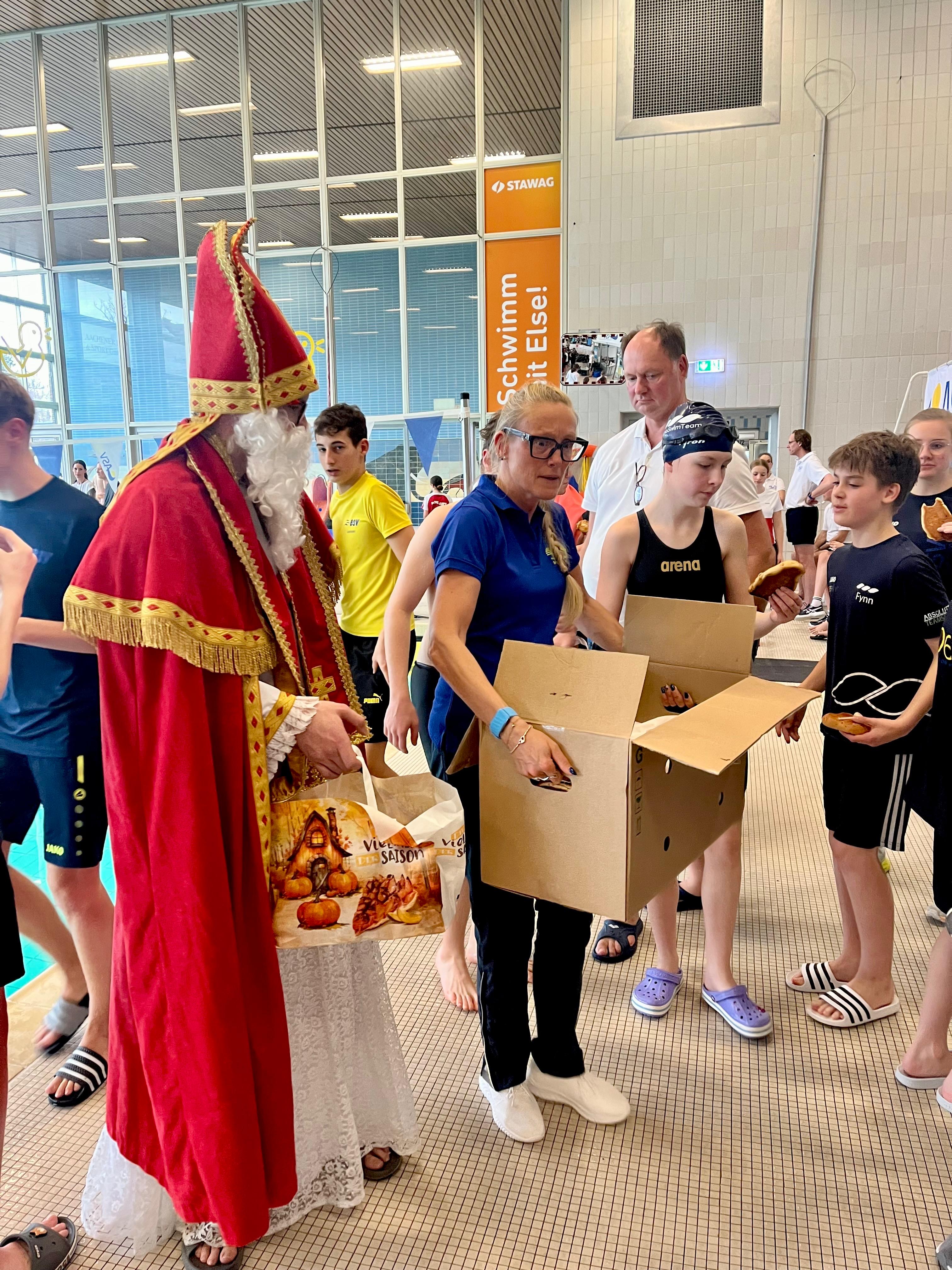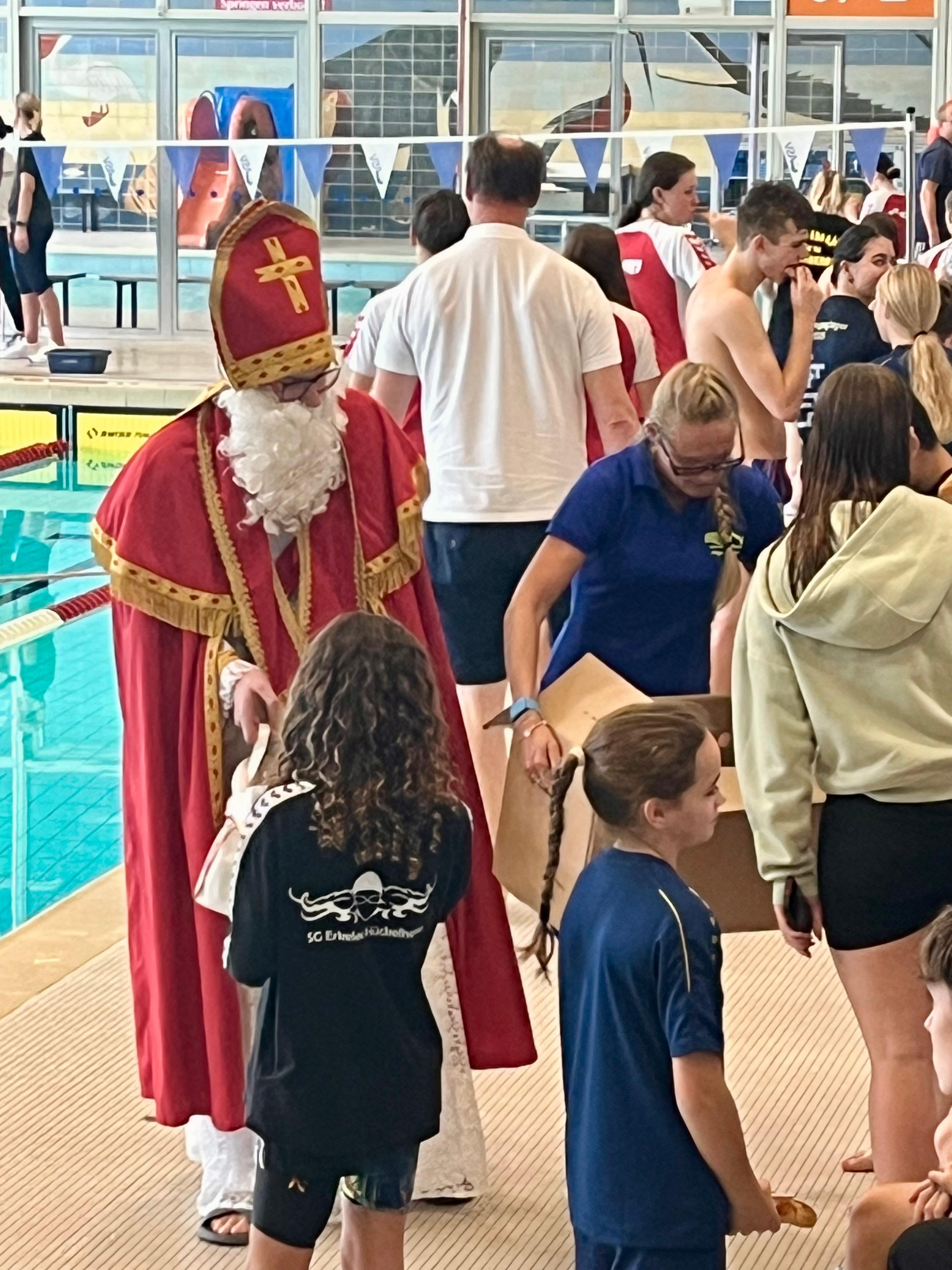 Zum Jahresabschluss, am 29.11.2025 – 30.11.2025, fanden die Bezirks-Kurzbahnmeisterschaften in der Schwimmhalle Aachen Ost statt. Traditionsgemäß kam natürlich auch wieder der Niklaus vorbei und die Schwimmer und Schwimmerinnen, aber auch die Kampfrichter und Schiedsrichter erhielten vom Nikolaus einen leckeren Broiche Mann.